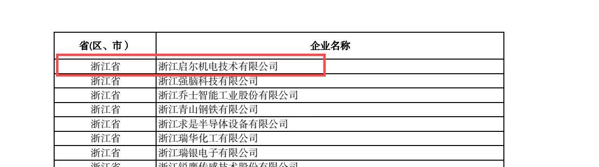 2024年9月2日,浙江省经信厅发布了《关于浙江省第六批专精特新“小巨人”企业名单的公示》,经过严格的评审和综合评估,浙江启尔机电技术有限公司凭借其在装备制造领域的卓越表现,成功通过遴选,荣获专精特新“小巨人”称号。