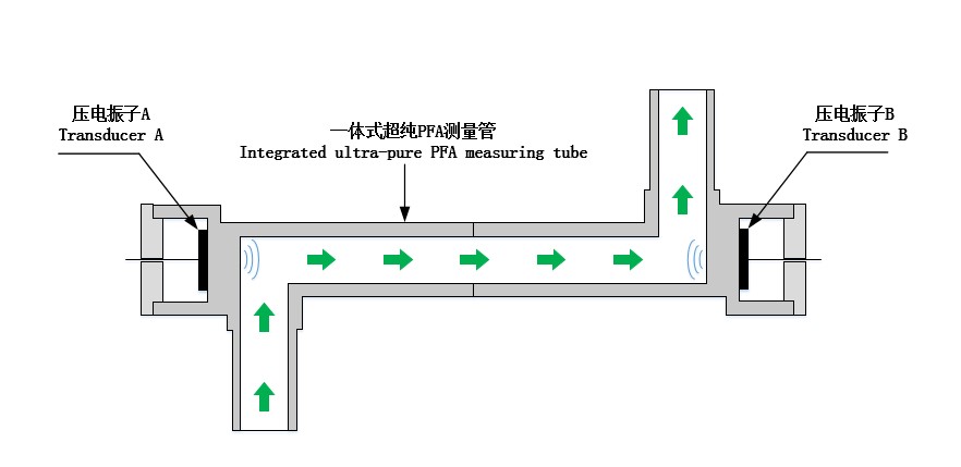 一对换能器(UT)相对平行,垂直测量管两侧安装。在控制器(Controller)作用下依次完成超声波信号的顺流发射接收与逆流发射接收,并分别获取超声波信号的顺流传播时间和逆流传播时间,进而得知管道内流量与超声波顺逆流传播时间值,最终得到管道内的流量信息。